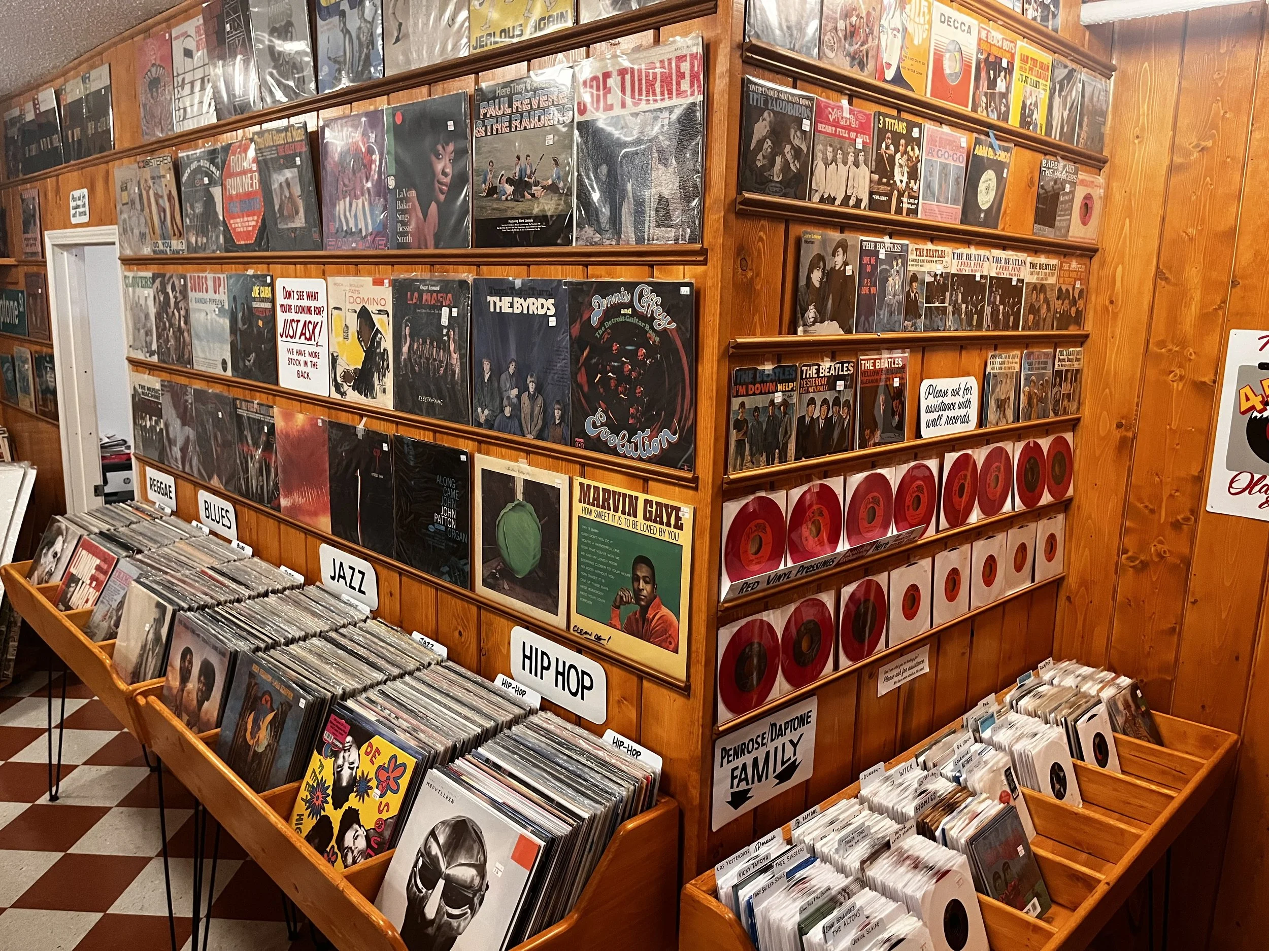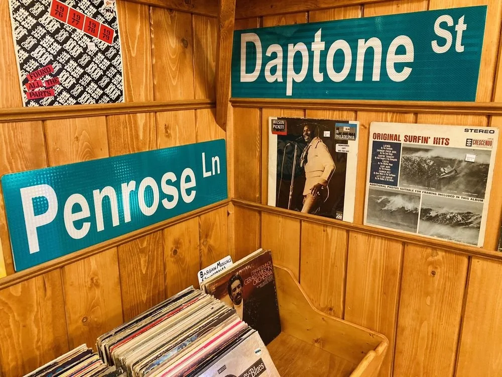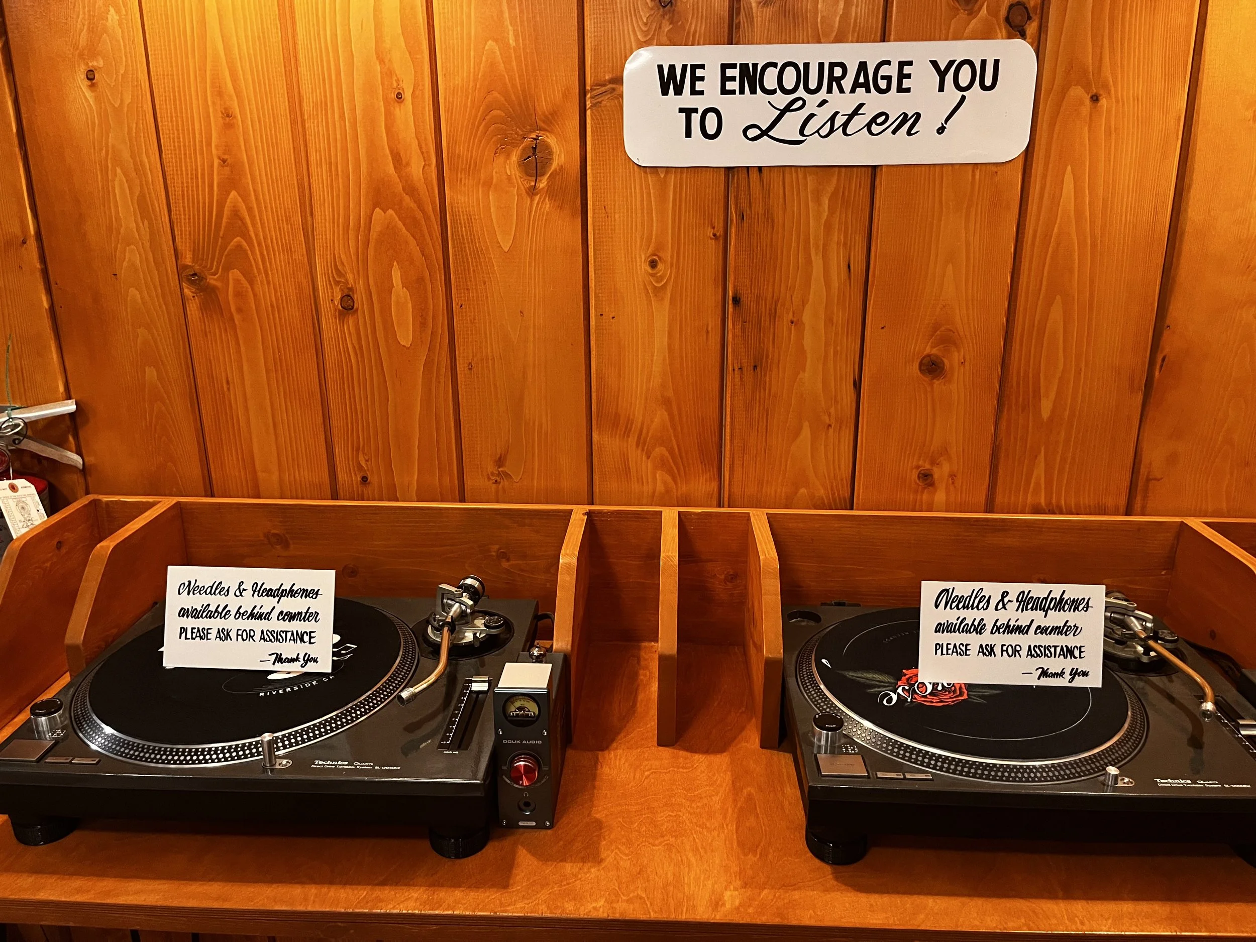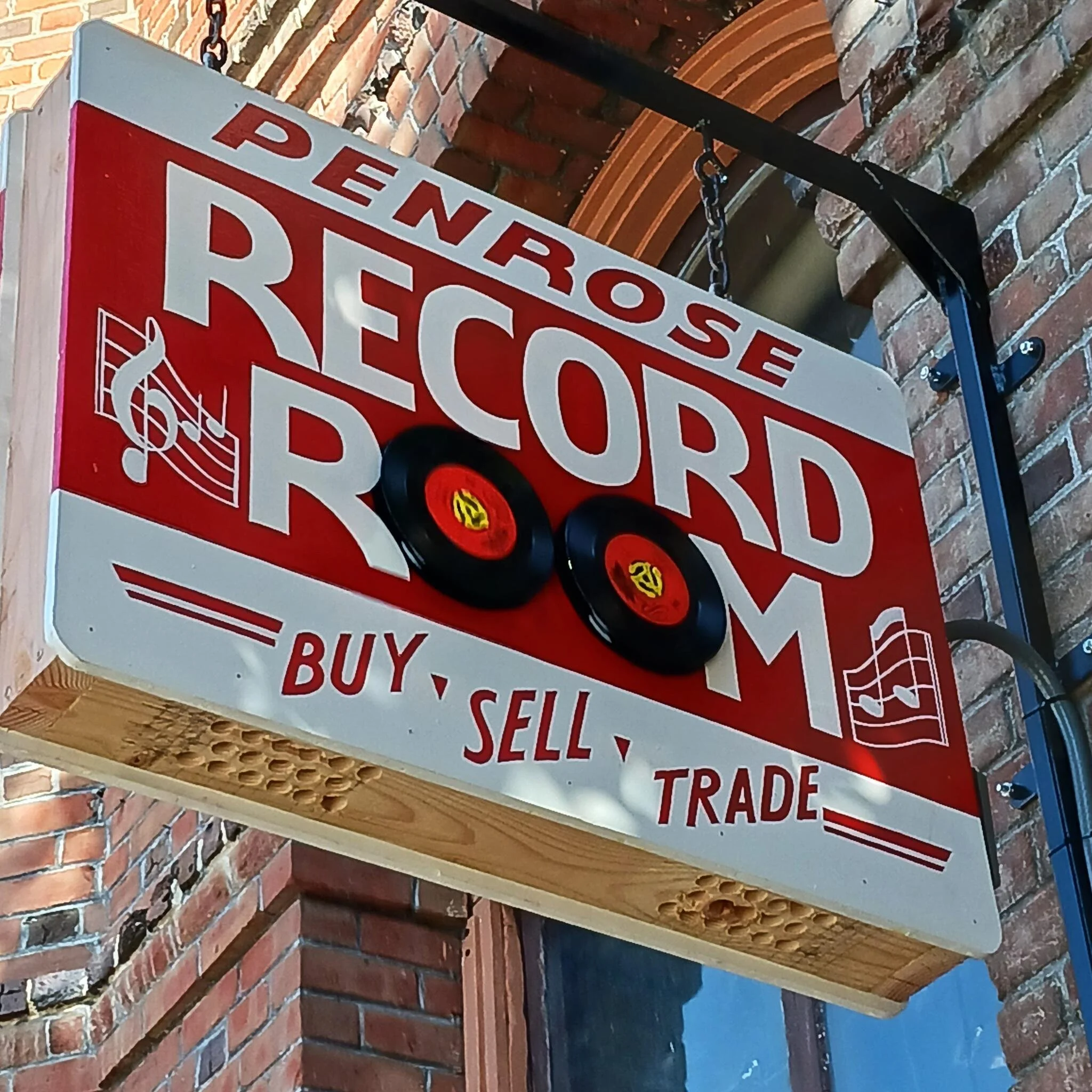 We built the shop with love and spared no effort in trying to create a timeless and welcoming vibe for our customers. The room has a cozy, vintage decor, a killer sound system, a wood paneled lounge, two listening stations, and hand-painted signs with messages like "We encourage you to listen!" Fans love to snap pics on the stage in front of the red velvet curtains and neon "Penrose" light or in front of the iconic spinning 45s on our motorized sign out front.