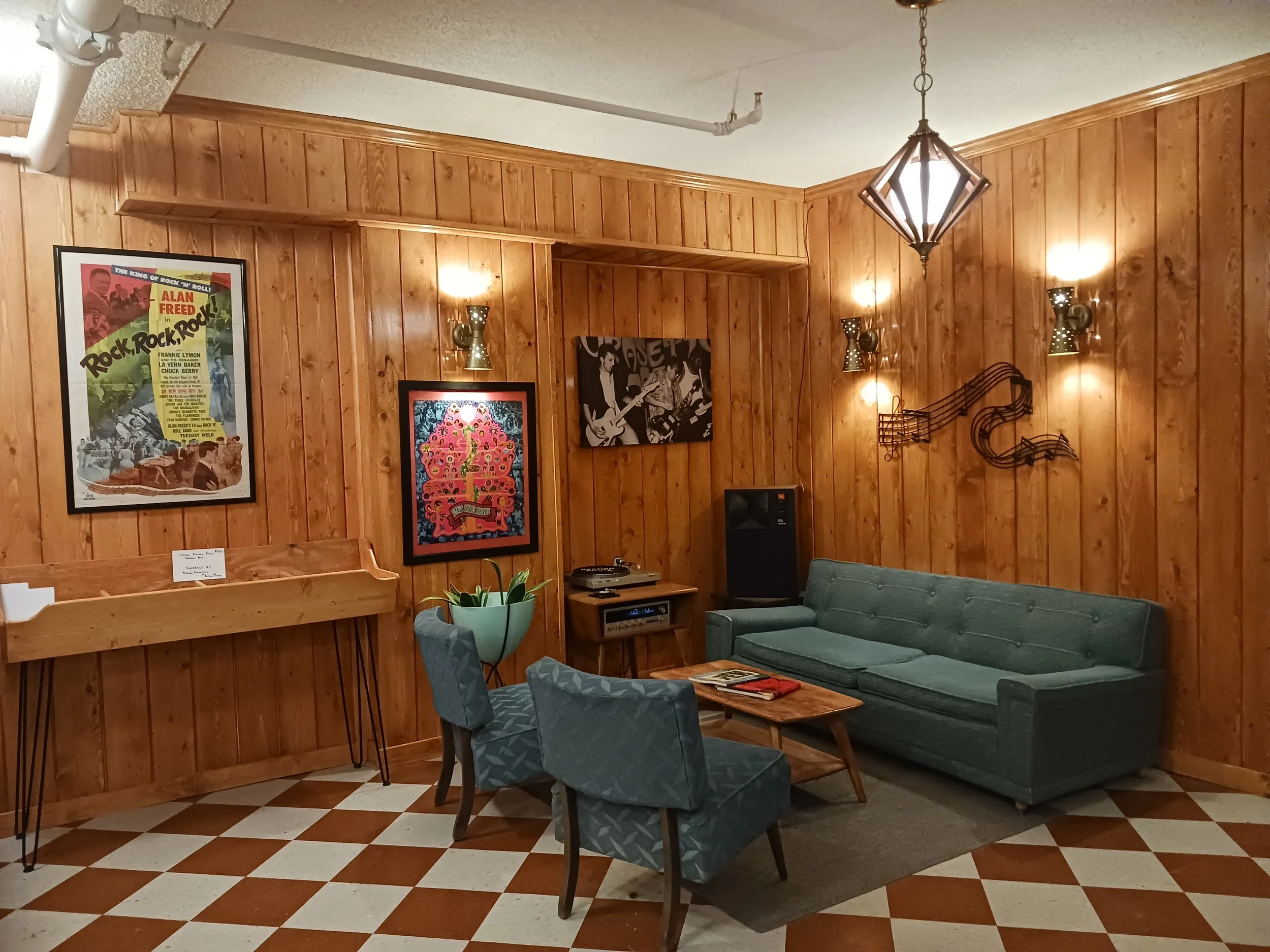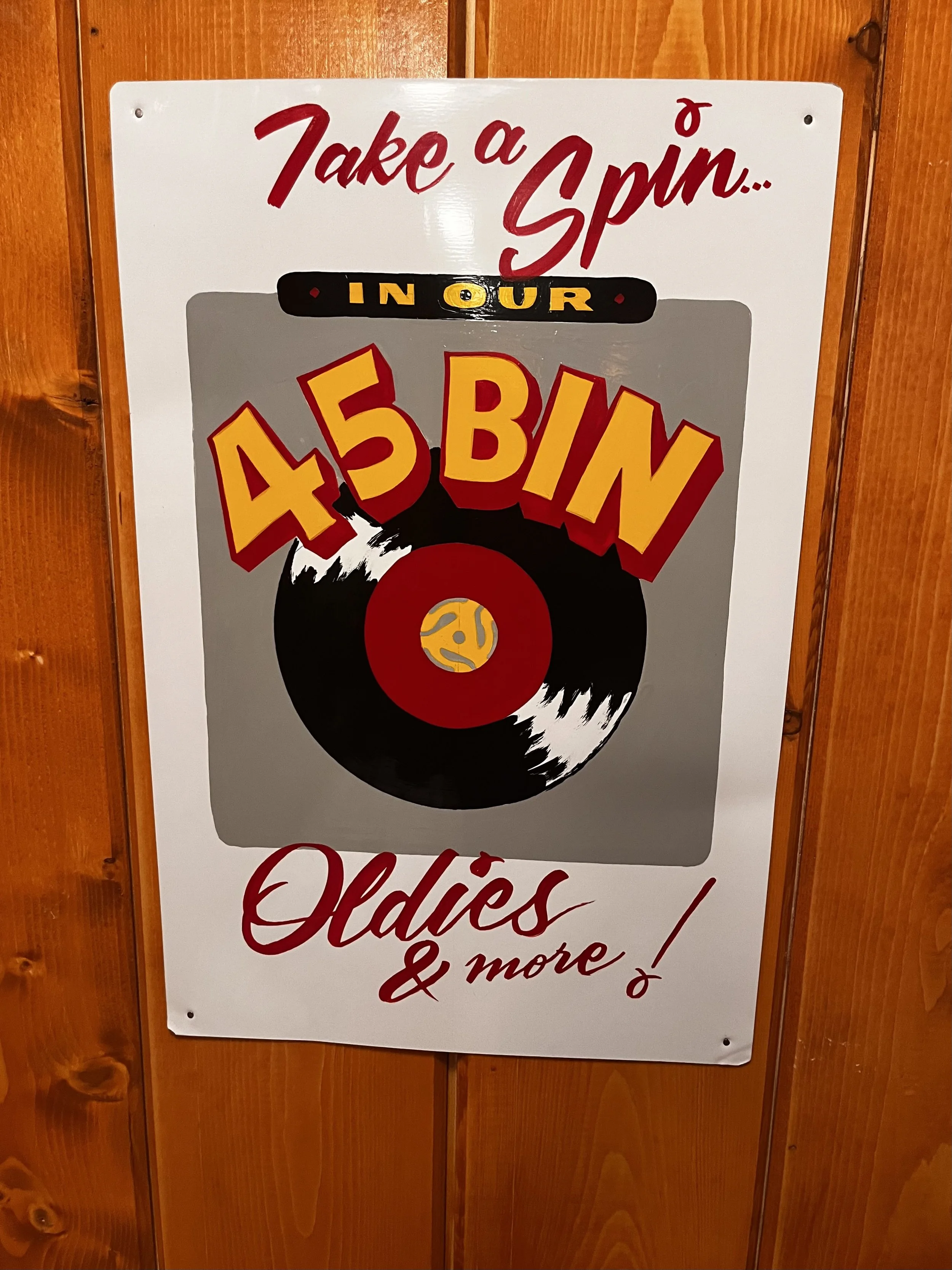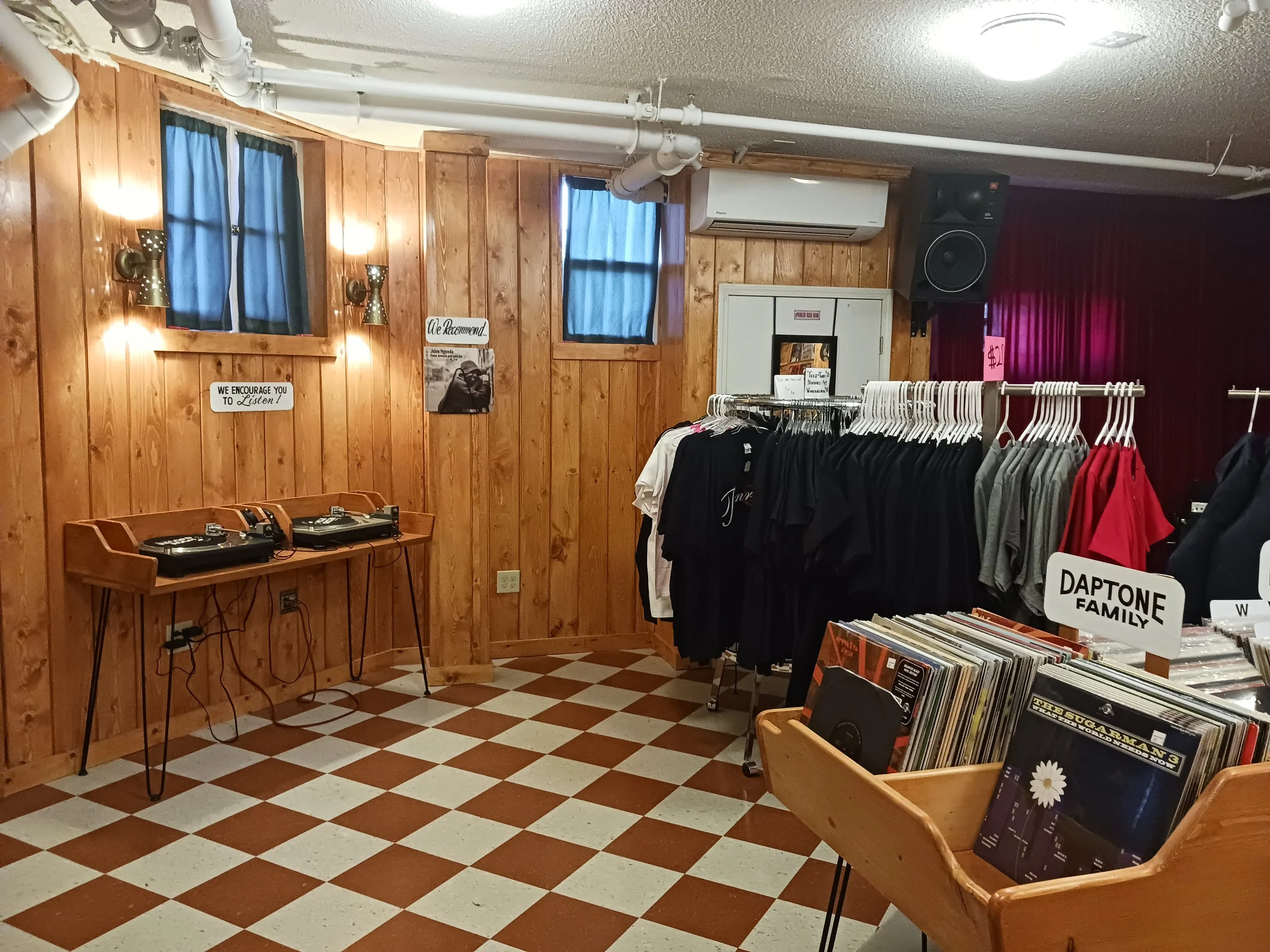 We built the shop with love and spared no effort in trying to create a timeless and welcoming vibe for our customers. The room has a cozy, vintage decor, a killer sound system, a wood paneled lounge, two listening stations, and hand-painted signs with messages like "We encourage you to listen!" Fans love to snap pics on the stage in front of the red velvet curtains and neon "Penrose" light or in front of the iconic spinning 45s on our motorized sign out front.
